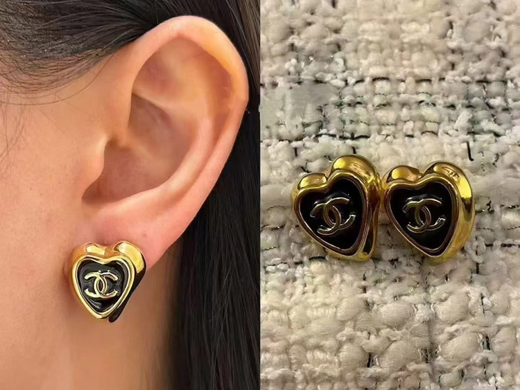 Chanel black enamel love double C gold edge earrings-3739